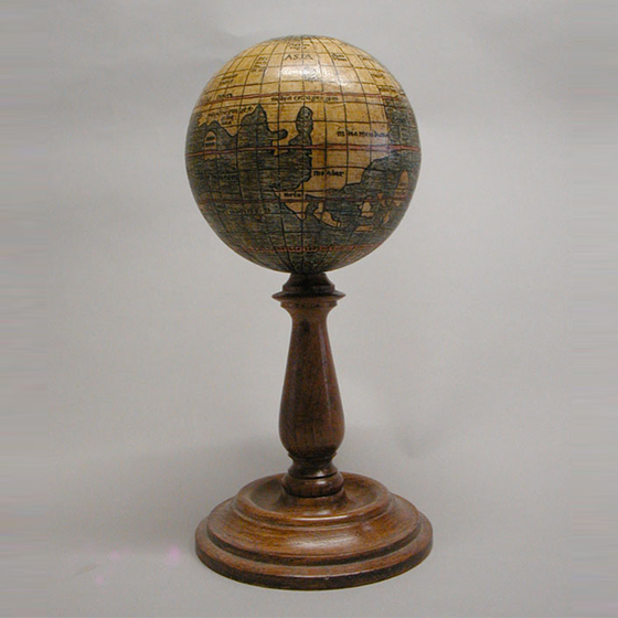 In 1507 Martin Waldseemuller published a small woodblock print of 12 terrestrial globe gores. The printed area was fourteen by seven inches and was designed to make the earliest surviving printed paper globe. This is a 3″ globe.